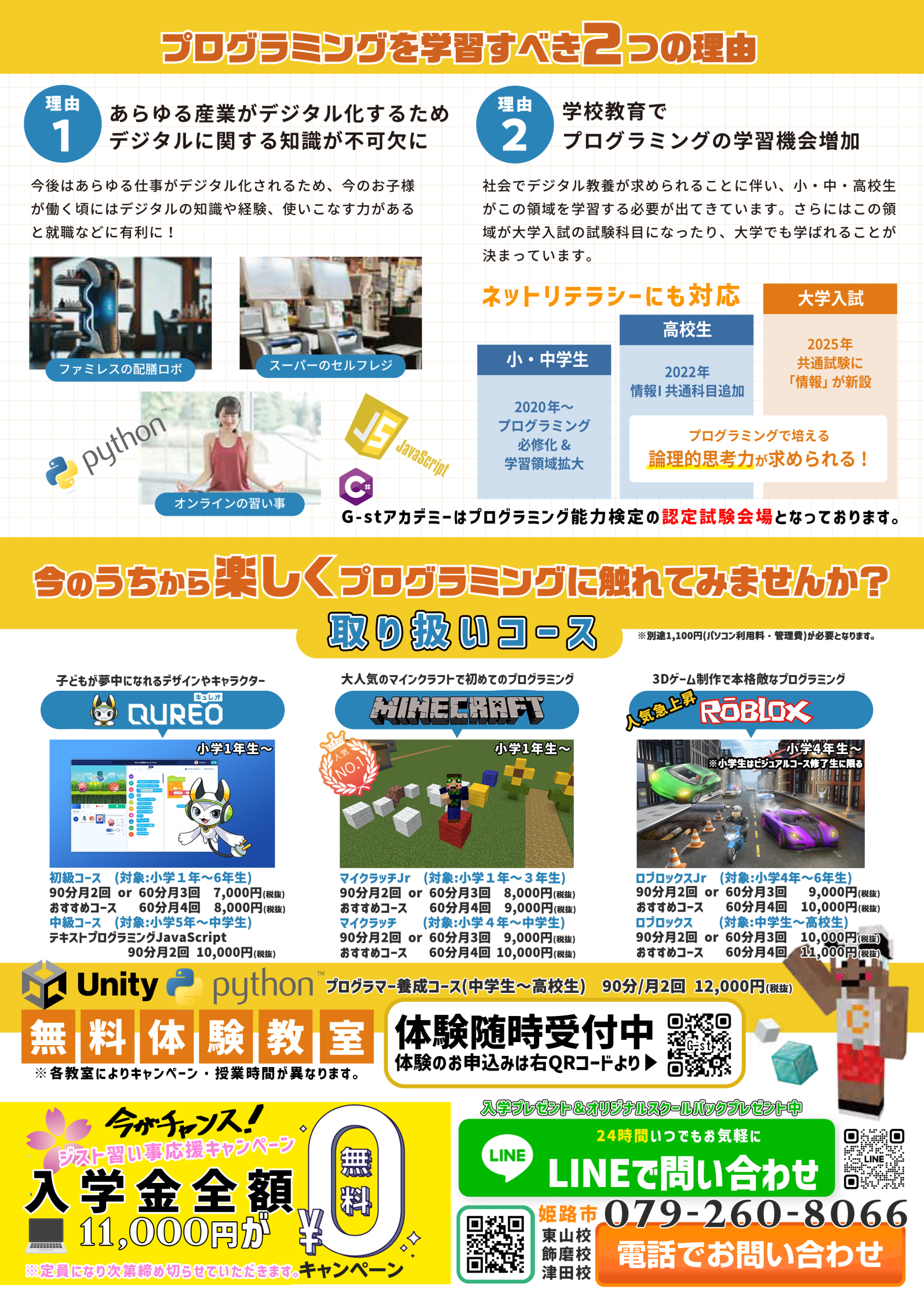 姫路発、小学生~高校生まで対応した、本格プログラミング教室です。無料体験会は随時開催中!